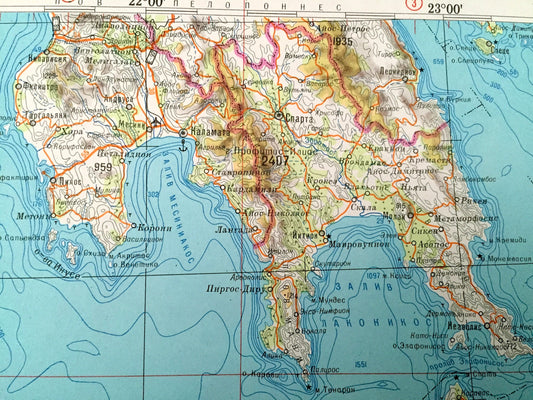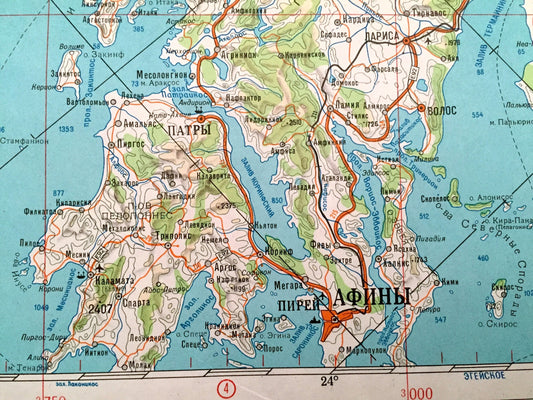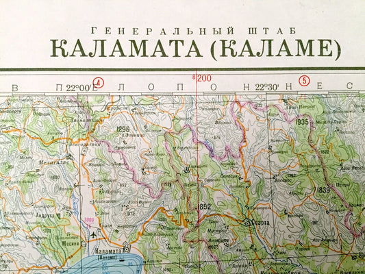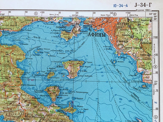 Antique SOVIET Athens, Greece 1980 Russia Army Survey Map – Sparta, Peloponnese, Kalamata Region, Nafplion, Pireas, Saronic Islands,