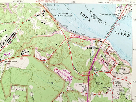 Antique Yorktown, Virginia 1965 US Geological Survey Topographic Map – York, James City County, Revolutionary War Battle National Park, VA