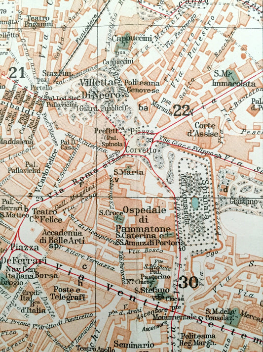 Antique 1937 Genoa, Italy Map from Muirhead's Blue Guides & Baedekers – Genova, Liguria, Carignano, Castelletto, Molo, Oregina, Ferrari