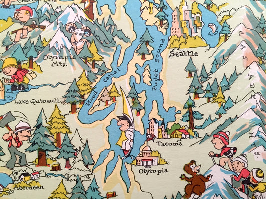Antique 1935 Washington State Map from Our Gay Geography by Ruth Taylor – Seattle, Olympia, Tacoma, Orcas Island, Bellevue, Spokane, Kent WA