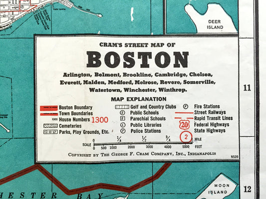 Antique 1938 Boston, Massachusetts Street Map by George F. Cram – Arlington, Cambridge, Belmont, Somerville, Winchester, Brookline, MA