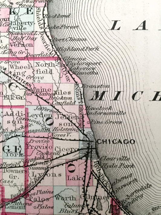 Antique 1855 Illinois State Map by Colton – Chicago, Lake, Cook County, Springfield, Galena, Aurora, Joliet, Waukegan, Highland Park, IL