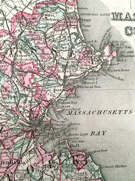 Antique 1855 New England County Map by Coltons – Massachusetts, Connecticut, Rhode Island, Cape Cod, Martha's Vineyard, Boston Berkshires MA