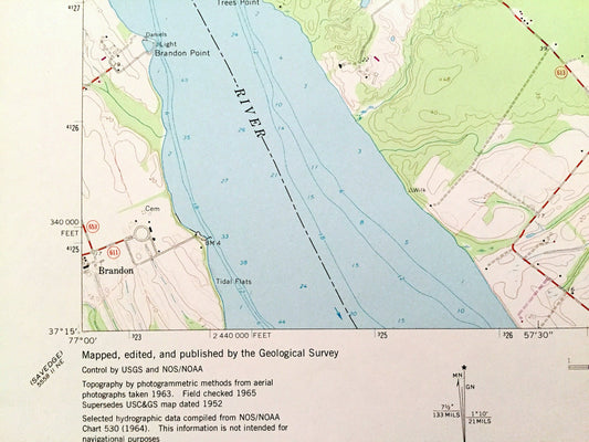 Antique Brandon, Virginia 1965 US Geological Survey Topographic Map – Charles City, James City County, James River, Chickahominy Wildlife VA