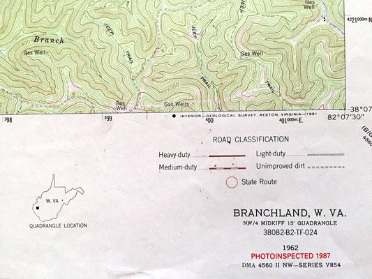 Antique Branchland, West Virginia 1962 US Geological Survey Topographic Map — Lincoln County, Sheridan, Carroll, Laurel Hill, Hubball, WV