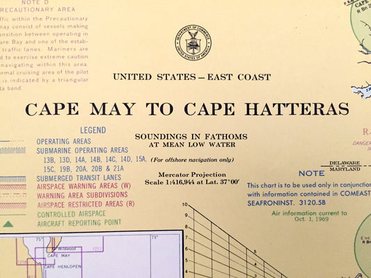 Antique Cape May to Cape Hatteras 1969 US Coast Guard Nautical Map – New Jersey, Delaware, Maryland, Virginia, North Carolina, Bethany Beach