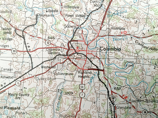 Antique Columbia, Tennessee 1956 US Geological Survey Topographic Map – Lawrenceburg, Fayetteville, Tullahoma, Shelbyville, Murfreesboro TN