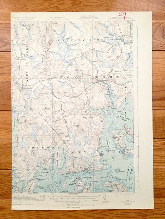 Antique Columbia Falls, Maine 1921 US Geological Survey Topographic Map – Jonesport, Jonesboro, Addison, Roque Bluffs, Marshfield Sealand ME