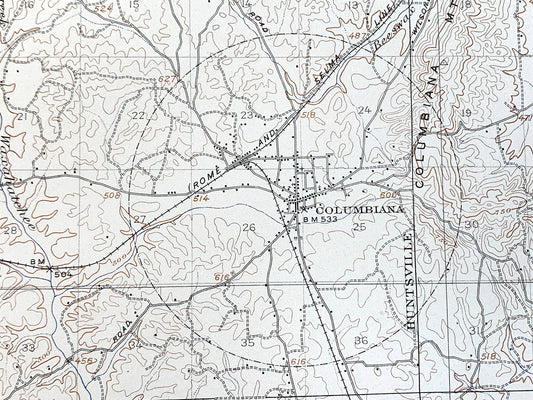 Antique Columbiana, Alabama 1940 US Geological Survey Topographic Map – Huntsville, Meridian, Coosa River, Shelby, Coosa, Chilton County, AL