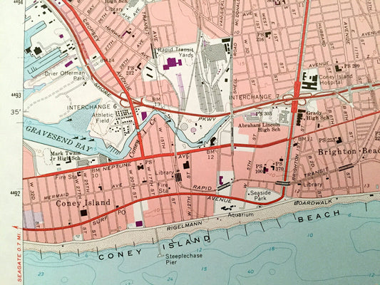 Antique Coney Island, New York 1966 US Geological Survey Topographic Map – Kings, Queens County, Brooklyn, Flatlands NY, Monmouth County, NJ