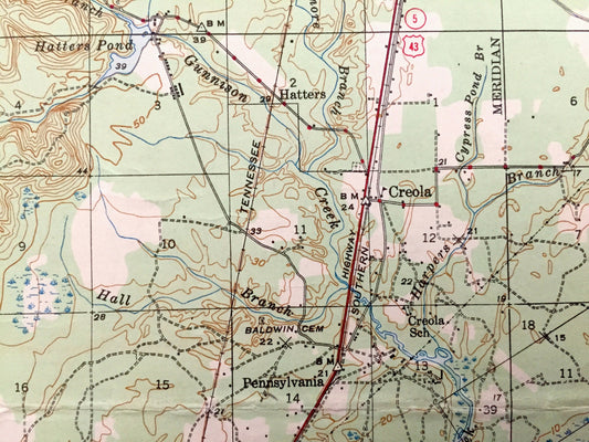 Antique Creola, Alabama 1943 US Geological Survey Topographic Map – Mobile County, Salco, Axis, Hatters, Saraland, Whistler, Smithtown, Akka