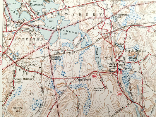 Antique Grafton, Massachusetts 1944 US Geological Survey Topographic Map – Worcester, Westborough, Quinsigamond, Northbridge, Shrewsbury, MA