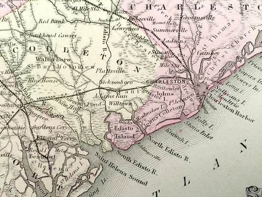 Antique 1874 South Carolina / Georgia State Map from O.W. Grays Atlas of United States of America; Stedman, Brown, Lyon – Charleston Atlanta
