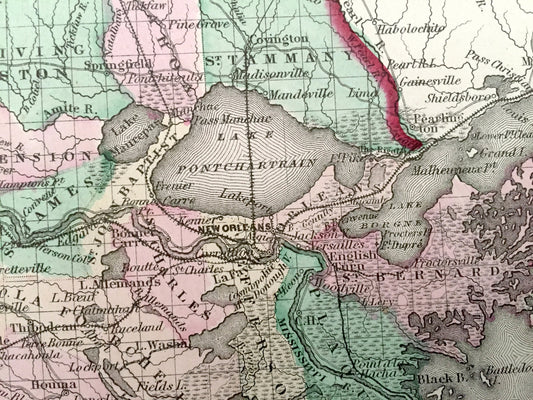 Antique 1874 Mississippi / Louisiana State Map from O.W. Gray's Atlas of United States of America; Stedman, Brown & Lyon – New Orleans
