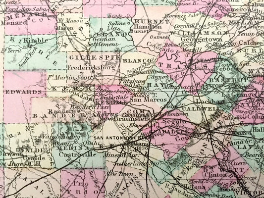 Antique 1874 Texas / Arkansas State Map from O.W. Gray's Atlas of United States of America; Stedman, Brown & Lyon – Austin, Little Rock