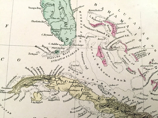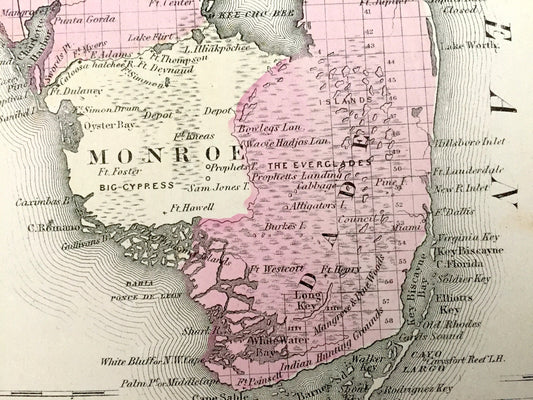 Antique 1874 Florida / Alabama State Map from O.W. Gray's Atlas of United States of America; Stedman, Brown & Lyon – Key West, Miami Beach
