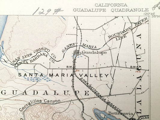 Antique Guadalupe, California 1905 US Geological Survey Topographic Map – Santa Barbara, San Luis Obispo County, Casmalia Surf Concepcion CA