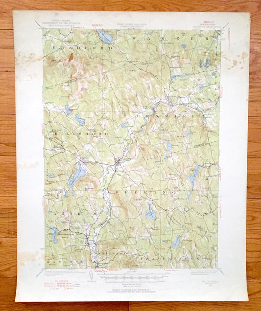 Antique Hillsboro, New Hampshire 1926 US Geological Survey Topographic Map – Merrimack County, Bradford, Warner, Henniker, Deering, Weare NH
