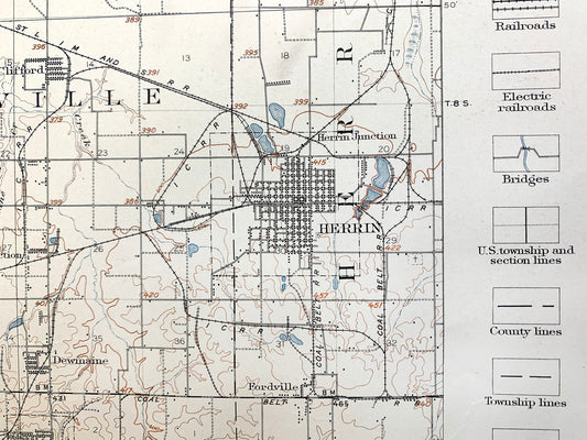 Antique Herrin, Illinois 1910 US Geological Survey Topographic Map – Carbondale, De Soto, Franklin, Williamson, Jackson, Perry County, IL