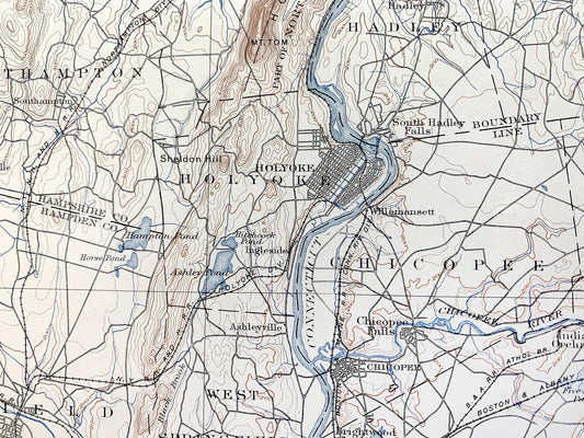Antique Holyoke, Massachusetts 1897 US Geological Survey Topographic Map – Springfield, Northampton, Deerfield, Amherst, Ashfield, MA