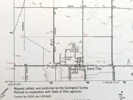 Antique Jerry City, Ohio 1969 US Geological Survey Topographic Map — Wood County, Center, Freedom, Portage, Montgomery, Bloom, Perry, OH