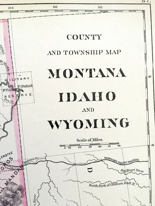 Antique 1882 Montana, Idaho & Wyoming County State Map by S. Augustus Mitchell – Yellowstone, Grand Tetons, Jackson Hole, Butte, Bozeman MT