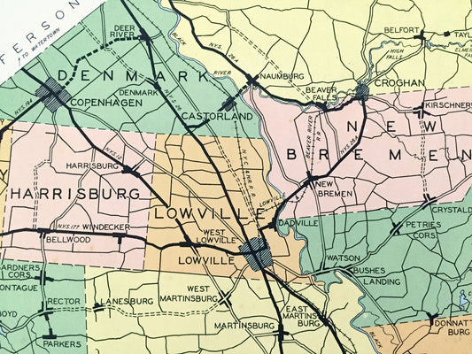 Antique Lewis County, New York 1941 Historical Atlas Map – Lowville, Port Leyden, Lyons Falls, Copenhagen, Harrisville, Croghan, Diana, NY