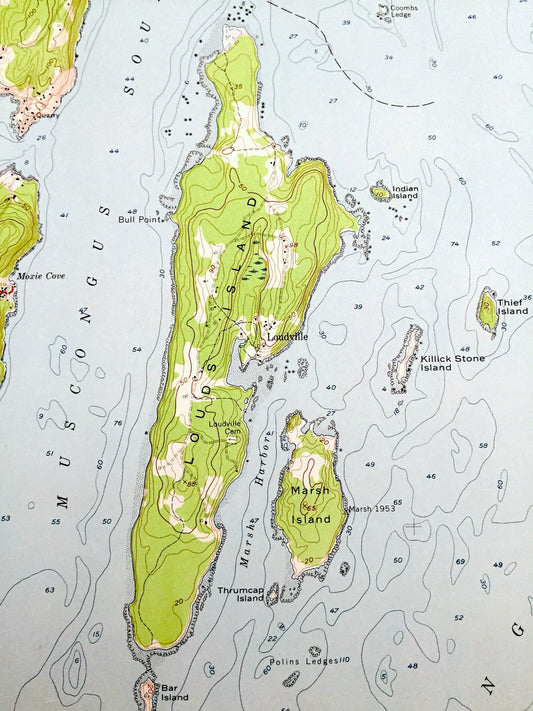 Antique Louds Island, Maine 1955 US Geological Survey Topographic Map – Knox, Lincoln County, Bremen, Bristol, Loudville, Muscongus, ME