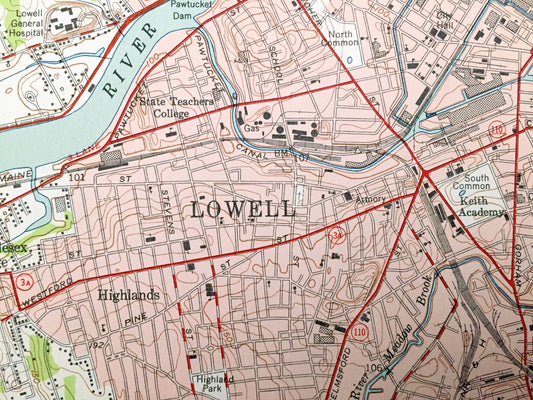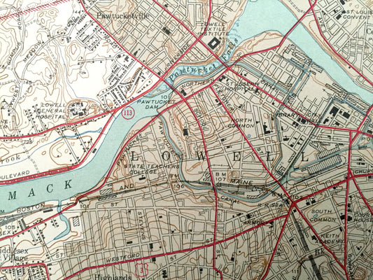 Antique Lowell, Massachusetts 1941 US Geological Survey Topographic Map – Middlesex County, Dracut, Chelmsford, Tewksbury Merrimack UMass MA