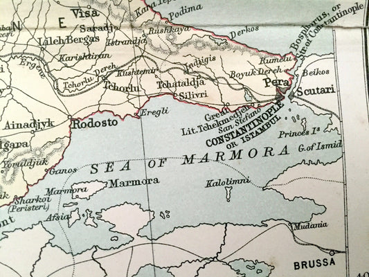 Antique 1888 Turkey in Europe Map from A & C Black's World Atlas – Greece, Macedonia, Bulgaria, Albania, Athens, Montenegro, Serbia, Hungary
