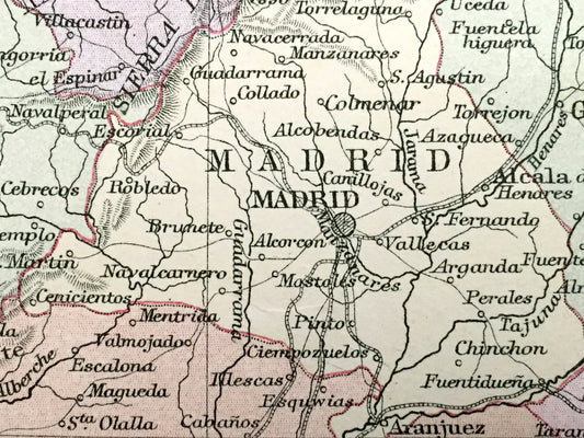 Antique 1888 Spain and Portugal Map from A & C Black's World Atlas – Madrid, Barcelona, Lisbon, Coimbra, Serra da Estrela, Gulf of Valencia