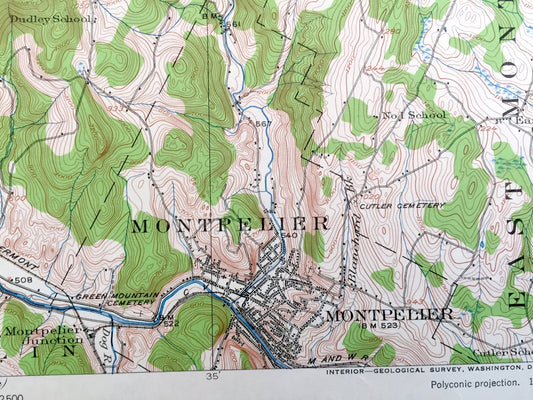 Antique Montpelier, Vermont 1919 US Geological Survey Topographic Map – Middlesex, Waterbury, Worcester, Stowe, Moretown, Calais, Elmore, VT
