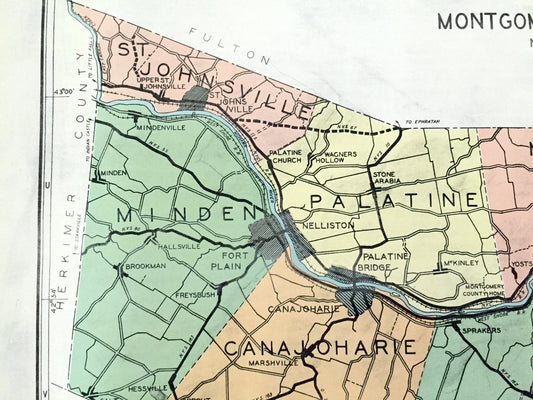Antique Montgomery County, New York 1941 Historical Atlas Map – Fonda, St. Johnsville, Amsterdam, Canajoharie, Charleston, Four Corners, NY