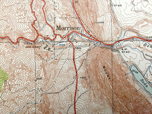 Antique Morrison, Colorado 1938 US Geological Survey Topographic Map – Golden, Idledale, Red Rocks, Jefferson County, Green Mountain