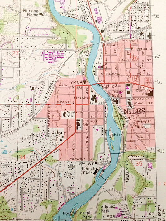 Antique Niles, Indiana 1971 US Geological Survey Topographic Map – Buchanan, Bertrand, Berrien County, St. Joseph County, Indiana, German IN