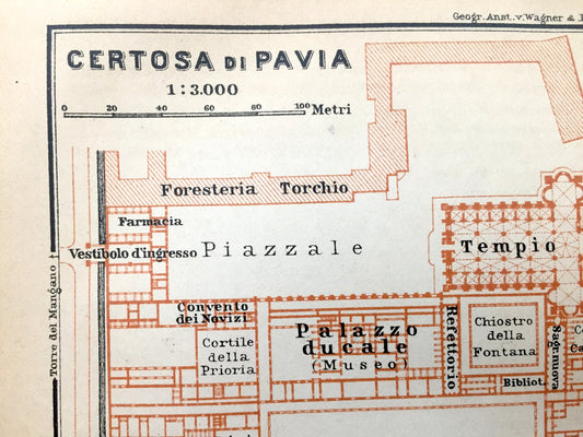 Antique 1904 Certosa di Pavia, Italy Map from Baedekers Guide – Lombardy, Monastery, Torre del Mangano, Naviglio di Pavia, Piazzale, Italia