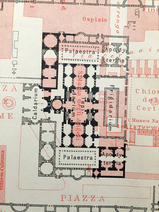 Antique 1904 Baths of Diocletian, Rome Italy Illustration from Baedekers Guide – Thermae Diocletianae, Roma, Viminal Hill, Piazza Terme