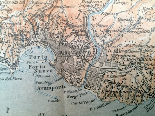 Antique 1904 Contorni di Genoa, Italy Map from Baedekers Guide – Liguria, Genova, Pontedecimo, Sestri, Nervi, Bolzaneto, Trensasco, Pegli