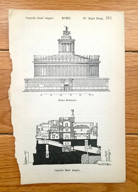 Antique 1904 Castel Sant' Angelo, Rome Italy Illustration from Baedekers Guide – Moles Hadriana, Hadrian, Ponte, Castle, Castello, Pen Ink