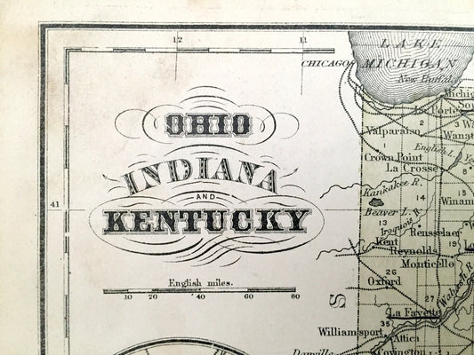 Antique Ohio, Indiana & Kentucky 1866 Rand McNally Map – Terre Haute, Indianapolis, Cleveland, Cincinnati, Louisville, Lexington, Akron