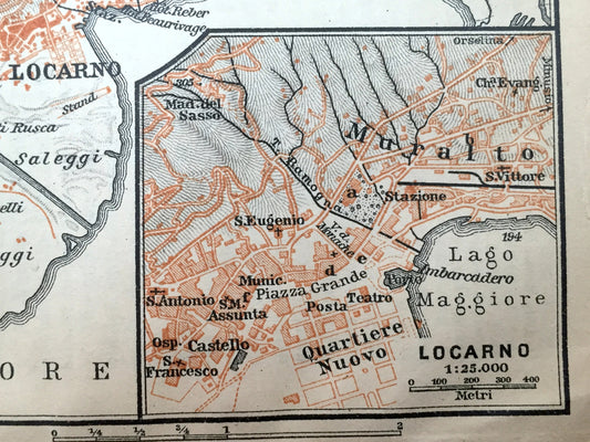 Antique 1904 Locarno, Switzerland Map from Baedekers Guide – Lago Maggiore, Alps, Losone, Ascona, Muralto, Gordola, Versico, Brione, Minusio