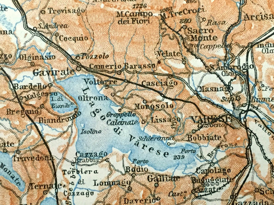 Antique 1904 Lago Maggiore, Italy Map from Baedekers Guide – Lombardy, Piedmont, Varese, Locarno, Pallanza, Stresa, Luino, Arona, Angera