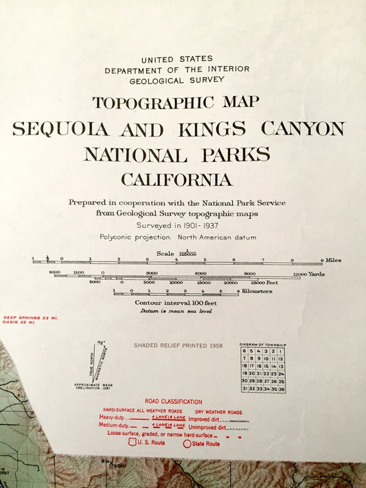 Antique Sequoia & Kings Canyon National Park, California 1958 US Geological Survey Topographic Map – Owens, Kaweah, Sierra, Mount Whitney CA