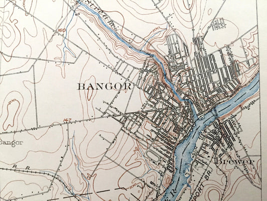 Antique Bangor, Maine 1902 US Geological Survey Topographic Map – Brewer, Hampden, Hermon, Orono, Pushaw Lake, Old Town, Penobscot County ME