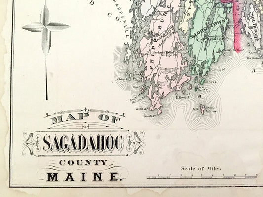 Antique 1890 Sagadahoc and Lincoln County, Maine Map by George N. Colby & Company – Bath, Boothbay, Phippsburg, Topsham, Bristol, Bowdoin ME