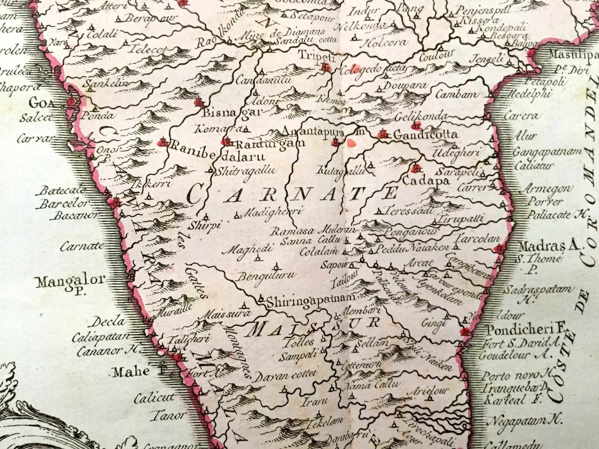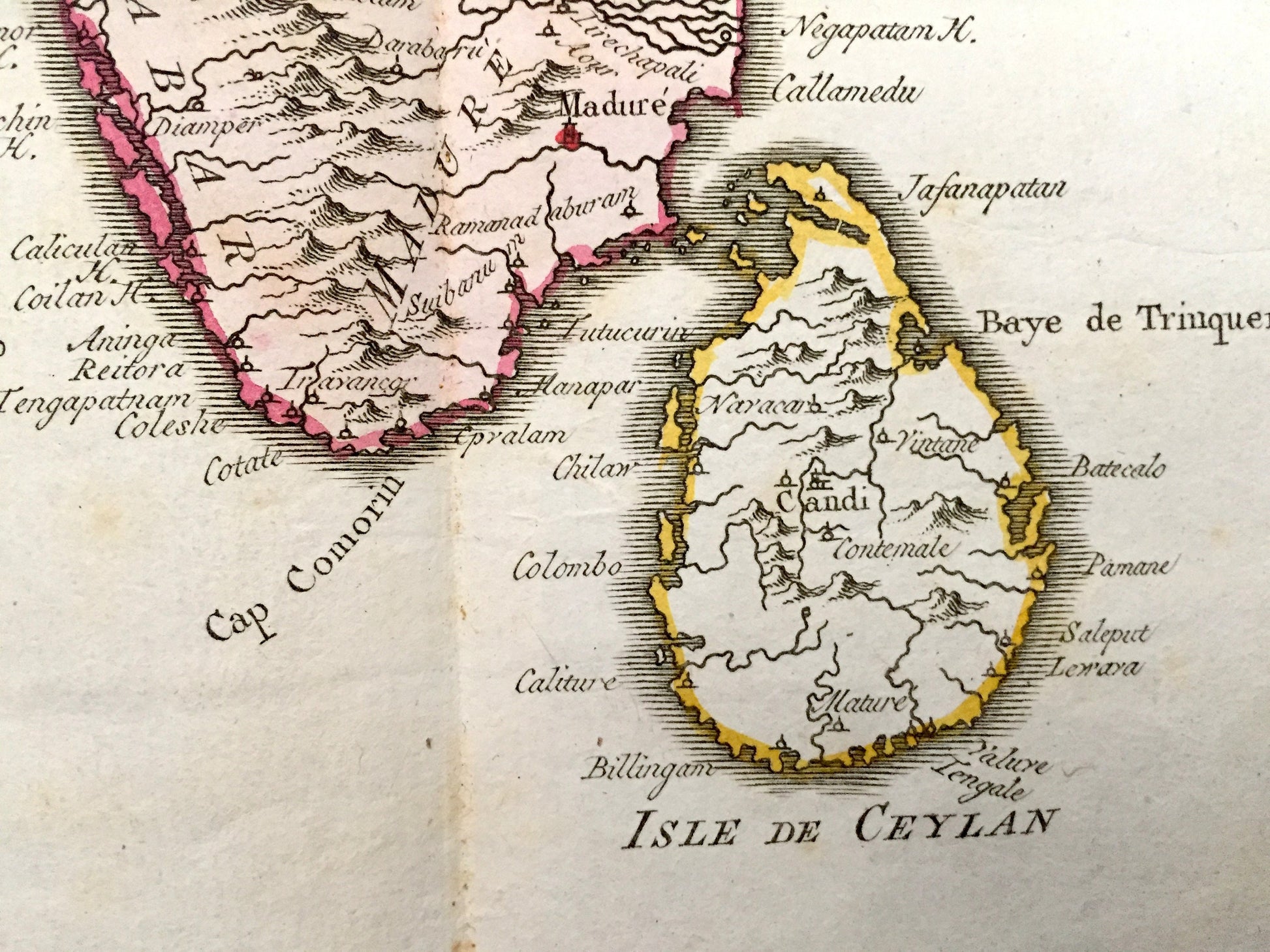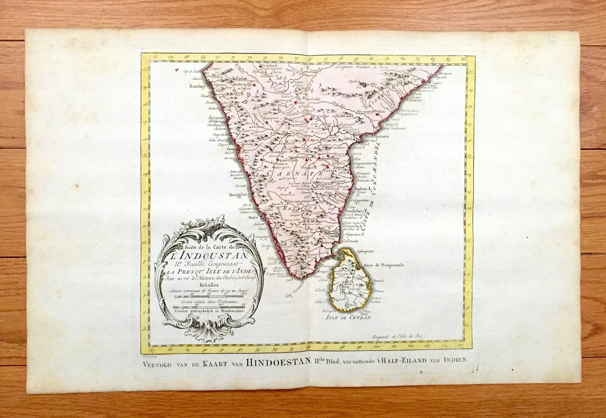 See what India and Sri Lanka looked like 250 years ago. Hand colored. Verso is blank. Lots of intricate, charming details like mountains and rivers and older city names. All text is in French and Dutch.
