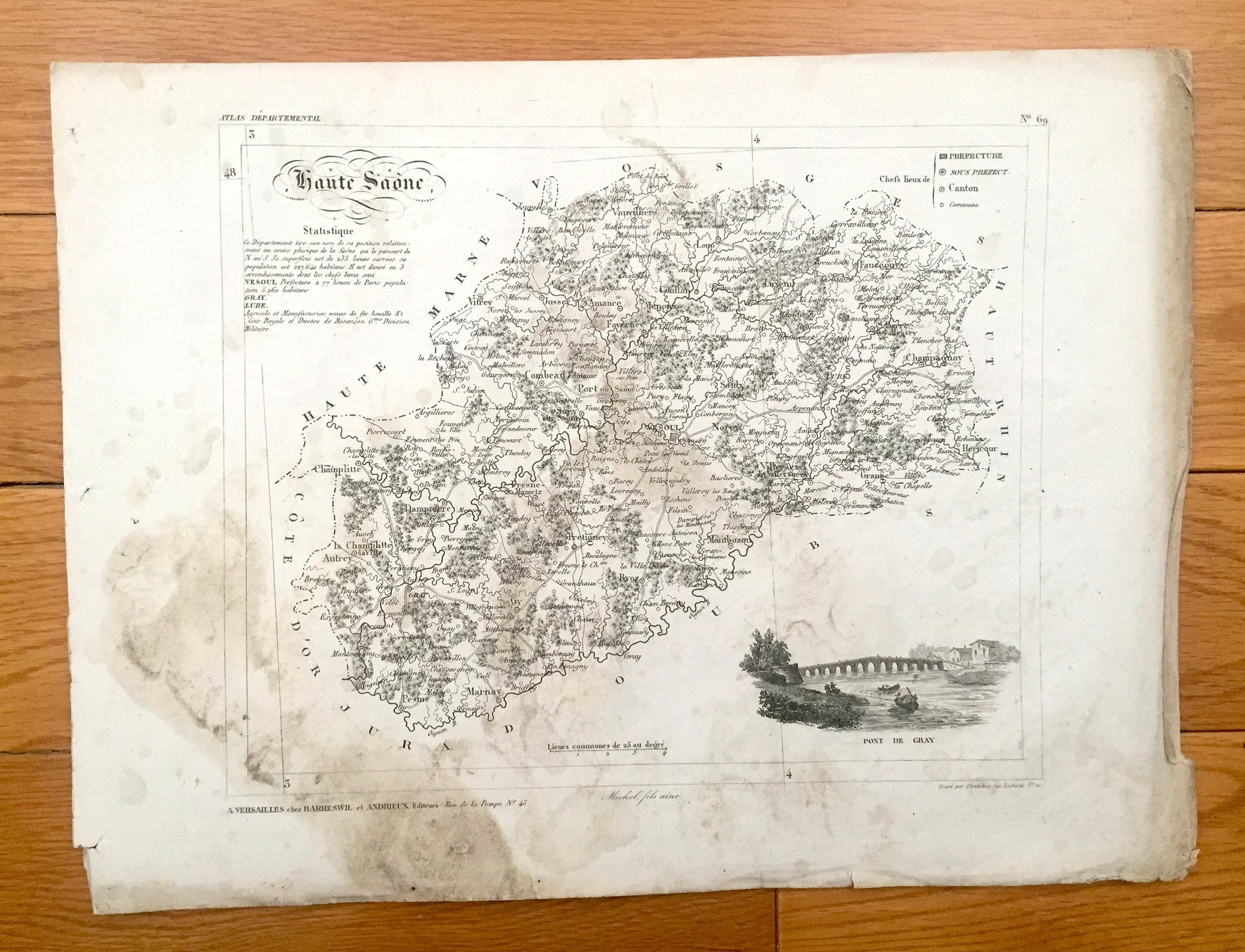 Beautiful, antique map of Haute-Saône Department of France by V. Monin, with an illustration of Pont de Gray. This is an authentic map taken from the renowned "Petit Atlas National des 86 Departements de la France et de Colonies" published in 1833 and NOT a computer reproduction.
