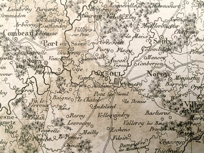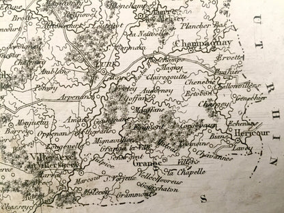 See what France looked like over 185 years ago. Lots of charming, intricate details and contours, including cities, towns, roads, rivers, forests and other landmarks. All text is in French. Verso is blank.