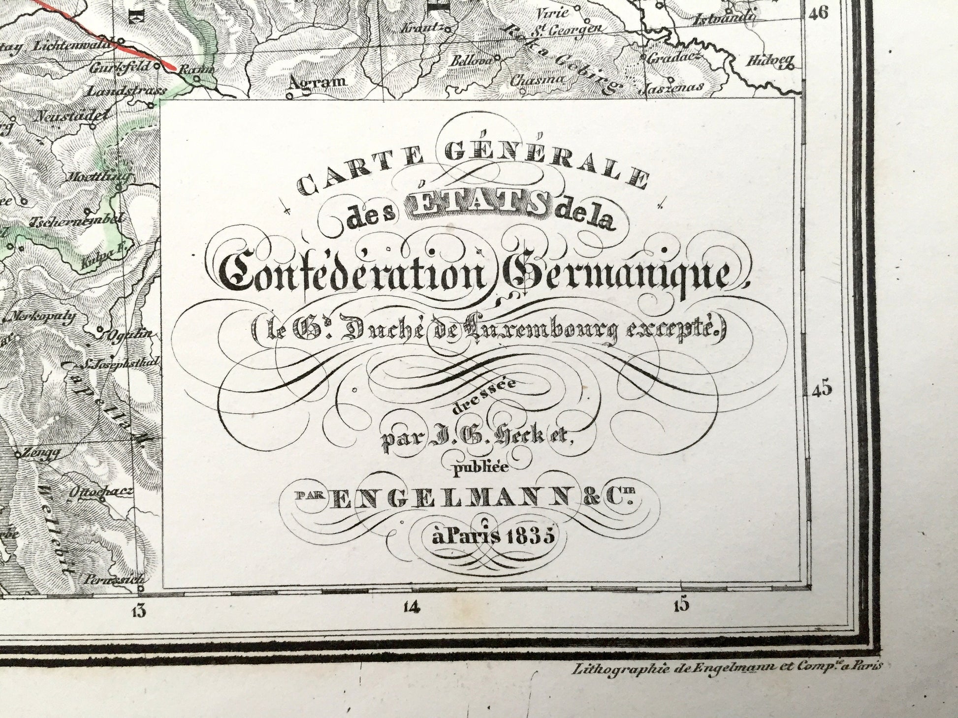 Beautiful, antique map of the German Confederation. This is an authentic 1835 stone lithograph from J.G. Heck's "Atlas Géographique, Astronomique et Historique" and NOT a computer reproduction. Plate No. 14. Very Fine Condition.