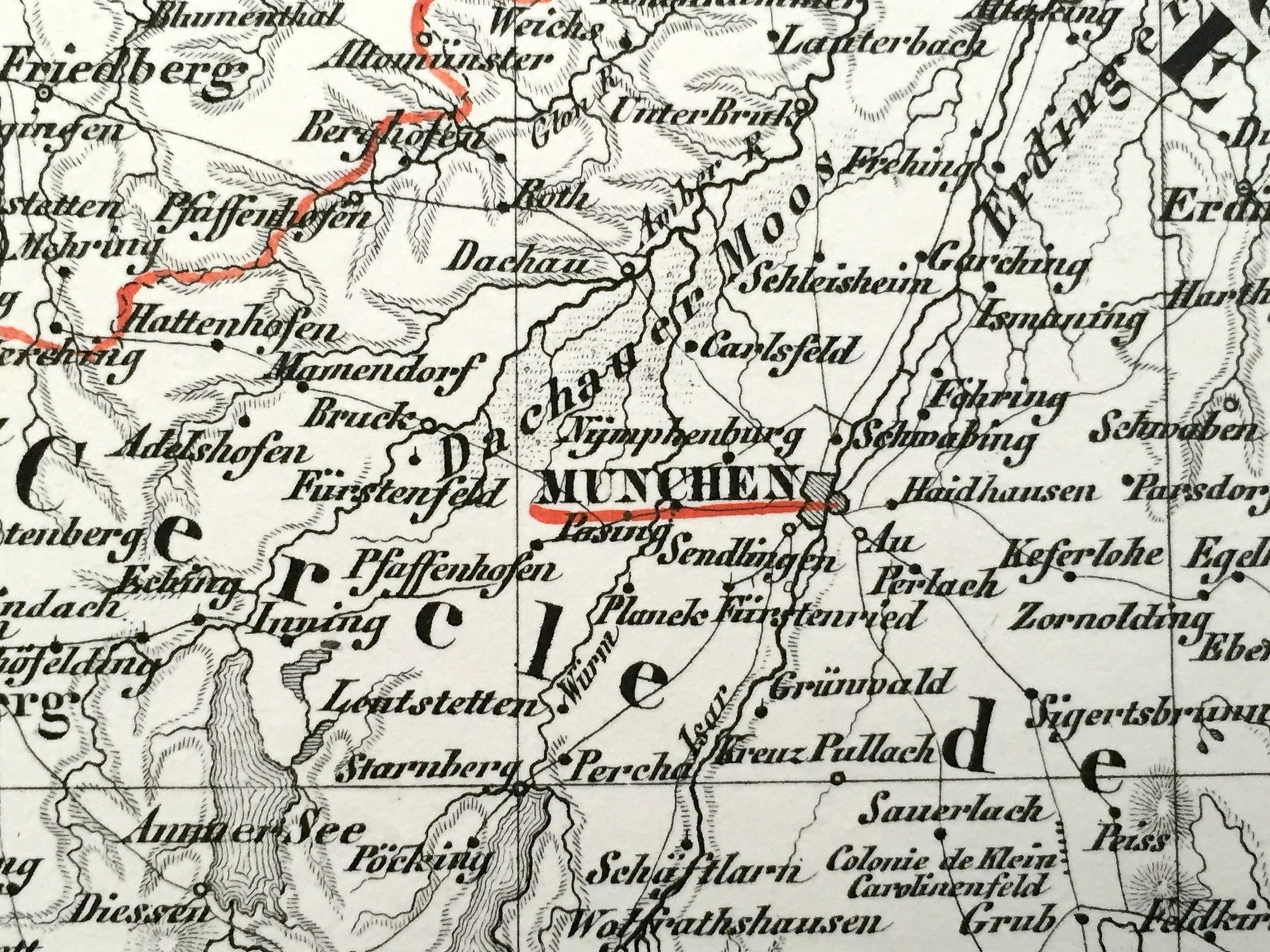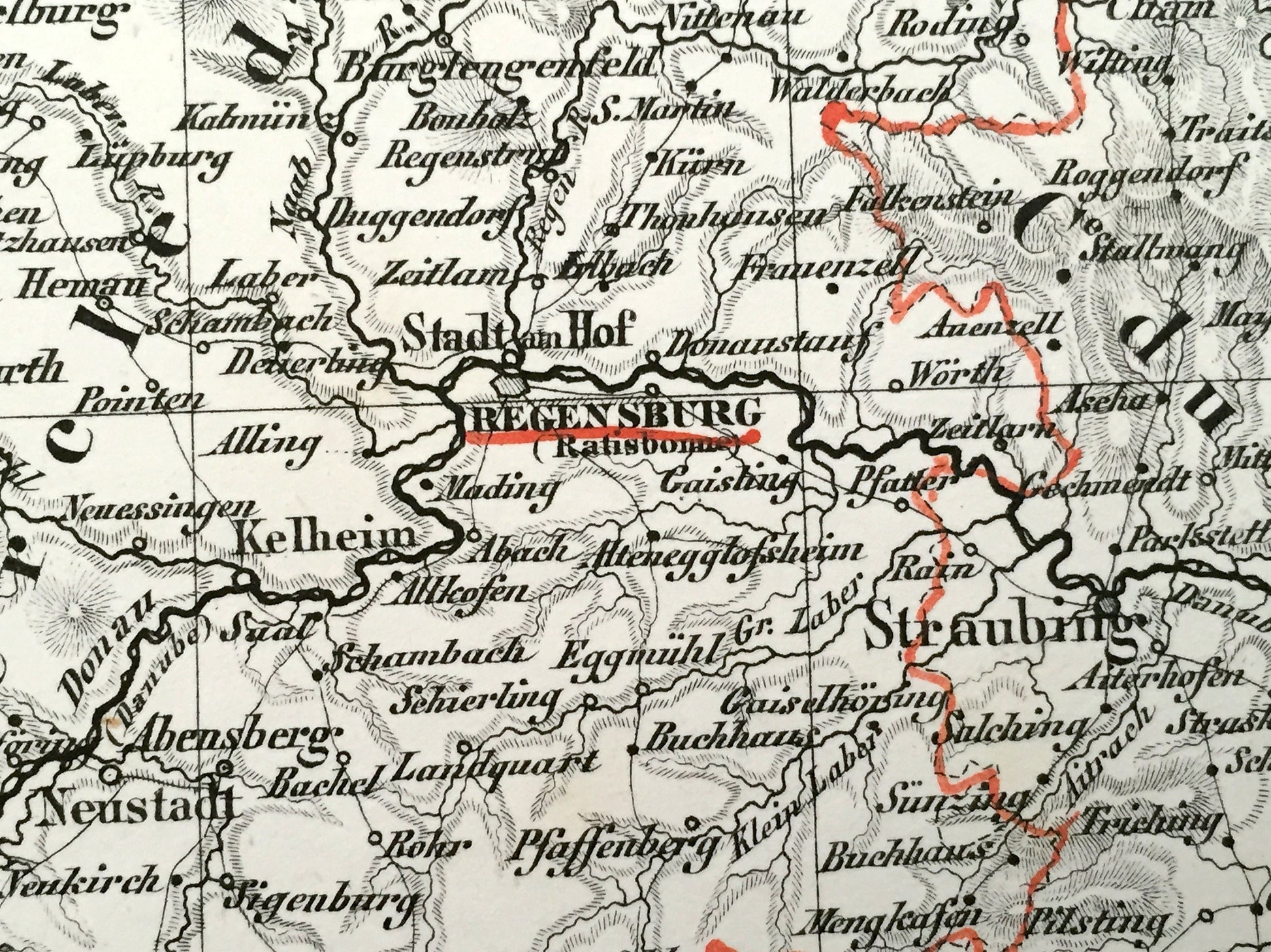 Points of Interest: Grand Duché de Bade, Baviere Rhénane, Hesse Darmstadt, Cercle du Main inférieur, Royaume de Württemberg, Prusse Rhénane, Nassau, Cercle de Forêt Noire, Royaume de Baviere, Cercle de l'Ilsar, Royaume de Boheme, Cercle du Danube, Cercle de la Regen, Tyrol, Helvétie, France, Autriche, modern-day locations such as Germany, Czech Republic, Switzerland, France, Austria, Munich, Stuttgart, Strasbourg, Bamberg, Nuremberg, Frankfurt, Salzburg, Pilsen, Coburg, and many more.